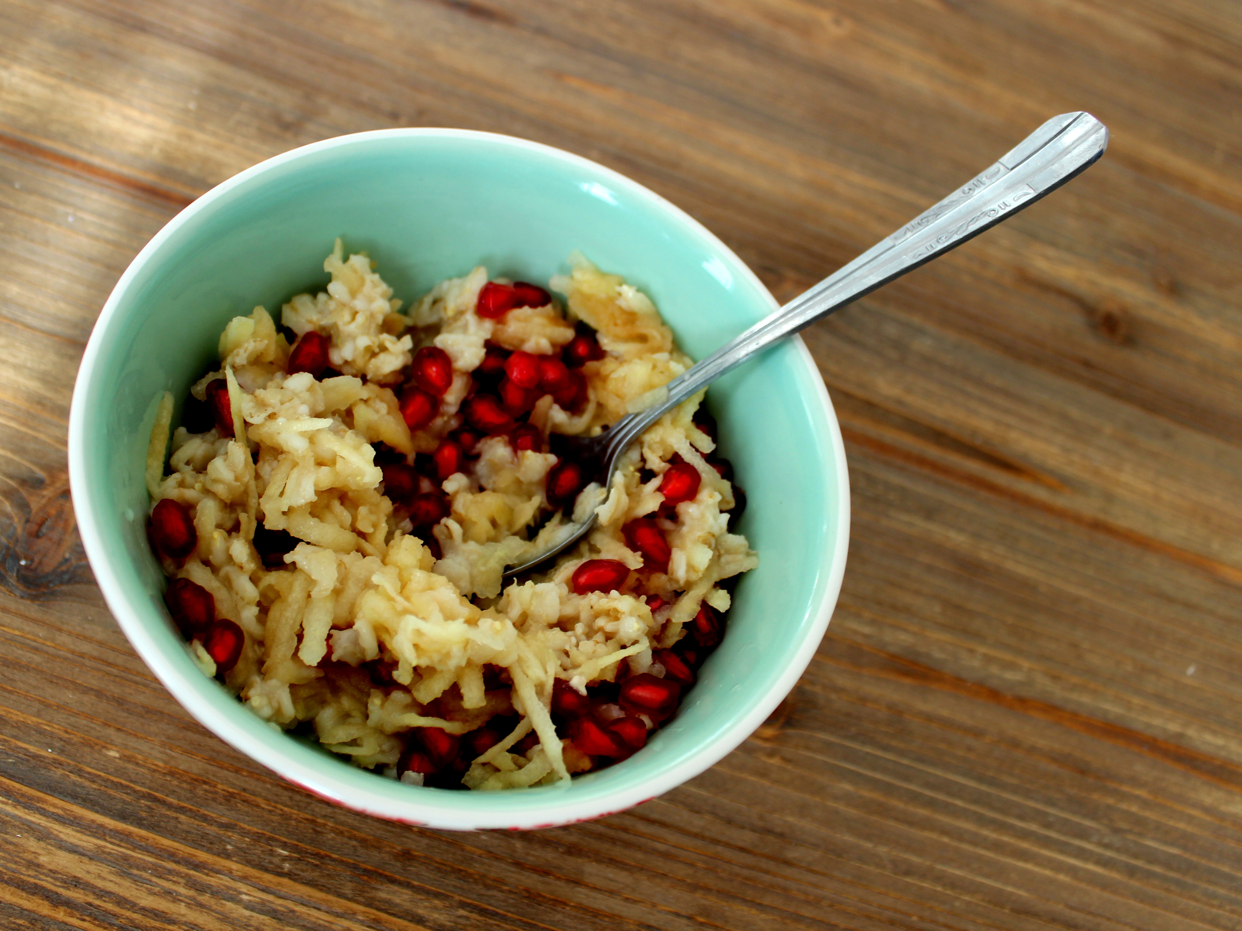 Dzisiaj na śniadanie owsianka. Jak zawsze prosta ale juz nie taka ekspresowa, bo trzeba obrać do niej granaty. W weekend mam rano więcej czasu. Nie śpieszę się by zaprowadzić dzieci do szkoły. Celebrujemy sobie śniadanie. Pijemy świeżo wyciskany sok, później lekka owsianka czyli porządna ilość błonnika 🙂