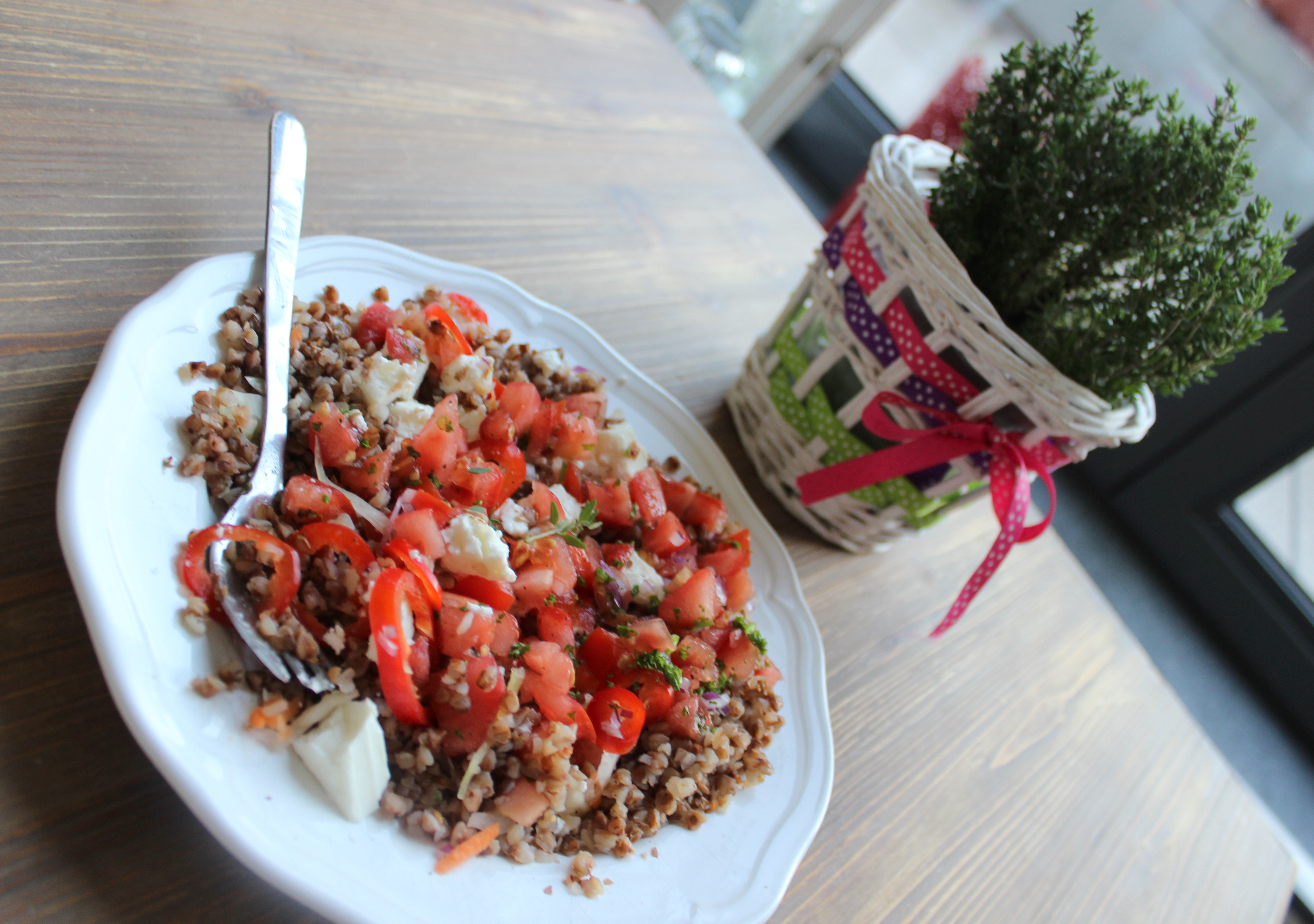 Do podstudzonej, (nie gorącej) kaszy dodaję warzywa, pokruszony ser feta, trochę świeżych ziół (jeśli je mam w doniczce) – tutaj akurat tymianek – i zajadam 🙂