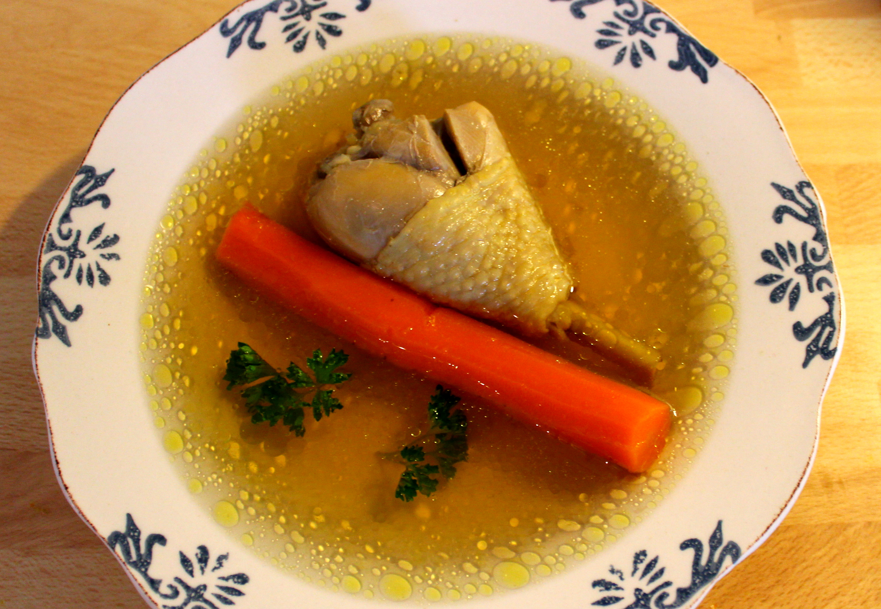 Ugotowałam lekki rosół drobiowy. W smaku dosyć warzywny, gdyż lubię dodać większą porcję włoszczyzny (Oprócz kapusty, która moim zdaniem psuje smak rosołu). Rosół przygotowałam również bez wołowiny, choć według niektórych jest ona niezbędnym składnikiem rosołu. To ulubiona zupa mojego synka.